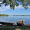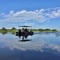 Das frisch aufgestellte Schild weist darauf hin, dass die Hakusembe River Lodge auf der Strasse nicht mehr erreichbar ist. Trotzdem versuche ich es mit dem Fahrrad, muss dann aber nach wenigen Kilometern aufgeben, weil die Strasse wirklich auf einer längeren Strecke unter Wasser ist. Theoretisch wäre es natürlich immer noch möglich, da das Wasser an der tiefsten Stelle wohl nicht viel mehr als einen Meter tief ist. Aber wer weiss schon, ob da nicht eine Wasserschlange, ein hungriges Krokodile oder Bilharziose auf mich wartet? Wie auch immer, ich bin dann umgekehrt und - wie auf dem Schild beschrieben - nach Mupini gefahren, wo ich mit dem Hakusembe Boat Shuttle "zur loge übertragen" wurde. Das Wasser ist auch bei der Lodge schon bedrohlich hoch und Nico, der Lodge Manager, ist nicht gerade glücklich über den immer noch steigenden Wasserspiegel.