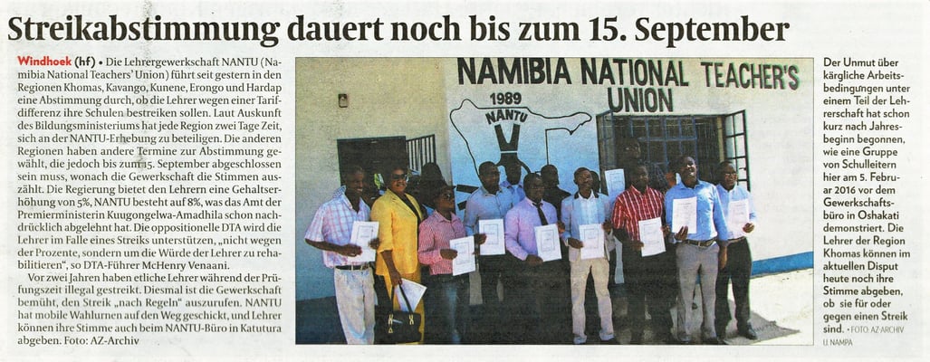 Obwohl es mit den Finanzen in Namibia eher schlecht bestellt ist, verlangt die Lehrerschaft, angeführt und angeheizt von der Gewerkschaft (Namibia National Teachers Union), 8% mehr Lohn und nicht nur 5%, wie von der Regierung angeboten. Alle anderen Staatsangestellten erhalten übrigens nur 2% mehr Lohn und selbstverständlich würden diese gerne auch mehr haben, aber wo nichts ist, da gibt es auch nichts zu verteilen! Aus meiner "fremden Sicht" ist dieses Verhalten der Lehrerschaft nur möglich, weil es viel zu wenig Lehrkräfte in Namibia gibt. Die fehlende Konkurrenz ist u.a. auch ein Grund, wieso die Qualität an den Schulen im Argen liegt und sich dieser kollektive Egoismus in dieser unfairen und unwürdigen Form ausbreiten kann.